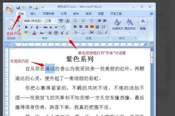 1、首先,“远程”在字符缩放中使用了命运效果。首先选择要设置的文本。从“开始”菜单中选择字体右下角的小按钮,打开“字体”对话框。