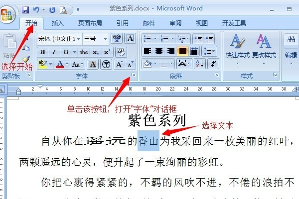 4、“香山”在字符缩放中使用细化效果。首先选择要设置的文本。从“开始”菜单中选择字体右下角的小按钮,打开“字体”对话框。