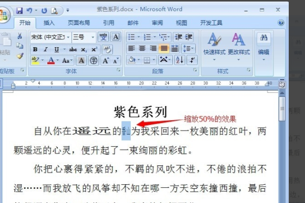 5、打开“字体”对话框,选择“字符间距”,选择缩放比例为50%。