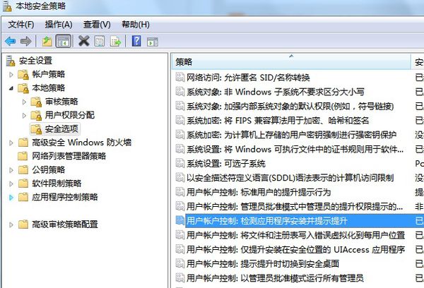 双击【用户帐户控制:检测应用程序安装并提示提升】,选中禁用;