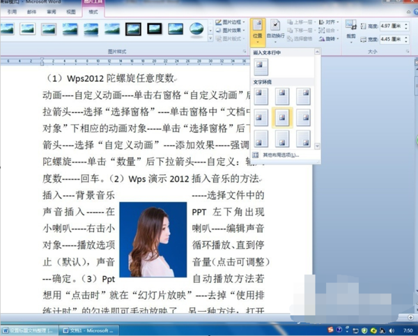 2、选中图片,工具栏上方弹出“图片工具”上下文菜单,单击上下文菜单的“格式”选项卡,在“排列”组中单击“位置”按钮,使用这里内置的位置样式可以改变图片在文档中的位置。