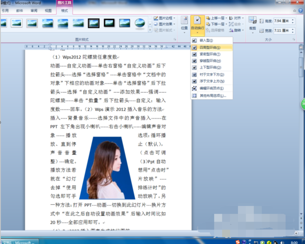 3、选中插入的图片,单击“格式”选项卡,在“排列”组中单击“自动换行”按钮,选择“四周型环绕”,图片矩形区域外环绕文字。