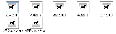 四周型环绕”、“紧密型环绕”、“穿越型环绕”、“上下型环绕”、“衬于文字下方”和“浮于文字上方”