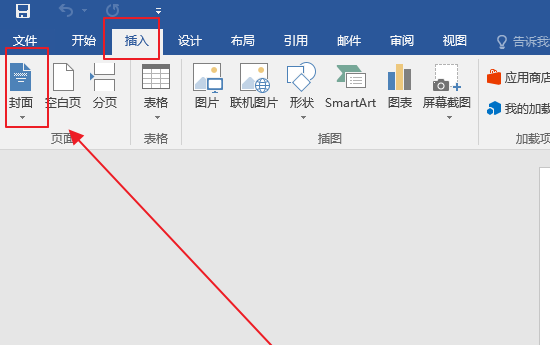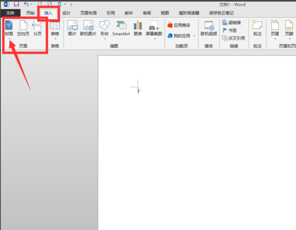 步骤二:在新建的空白Word文档编辑窗口,打开标题菜单栏的“插入”选项卡,然后再点击“页面”-->“封面”选项。如图所示;