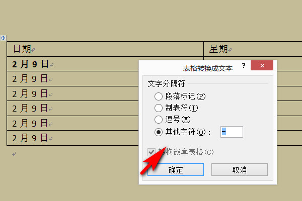 4.在【表格转换成文本】框内,选择【其他字符】,【其他字符】右侧空格内有短横【:】,意思是表格转换成文本内容之间的连接,如果需要,就保留,不需要时,可以将其删除掉。