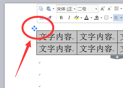 2、然后直接点击表格的左上角的十字光标位置,即可将表格连着文字内容全部选中。