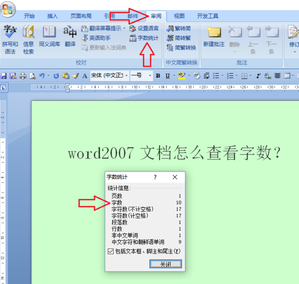 1、打开word2007文档,单击“审阅”菜单,单击“字数统计”命令。