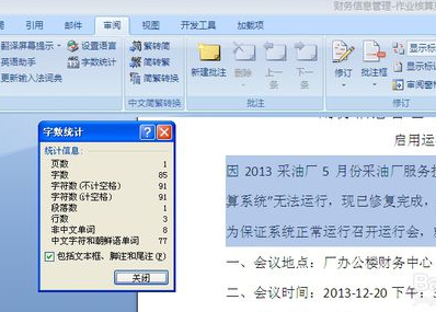 3、需要查看部分文本的字数,那么就先选中文本,点击审阅--字数统计,查看详细的信息