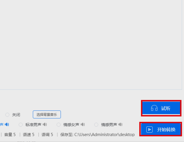 5、然后点击页面右下角的“试听”按钮进行试听,最后点击“开始转换”将文本内容转换为语音。完成以上设置后,即可利用迅捷文字转语音软件将文字转化成语音播放出来。