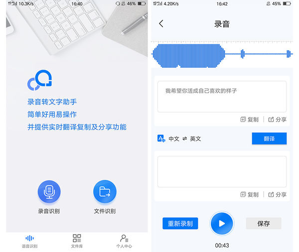 如果较长的录音文件,建议使用文件识别这个功能,识别完成后可保存识别出来的文本内容。