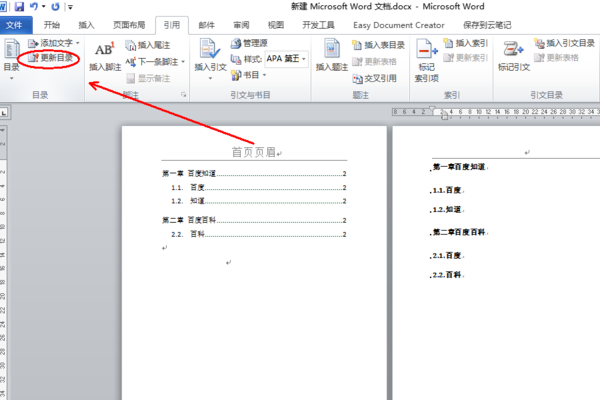 步骤一:将各个章节分别另起一页并改变标题之后,目录并未改变,此时,点击“引用”菜单中的“更新目录”
