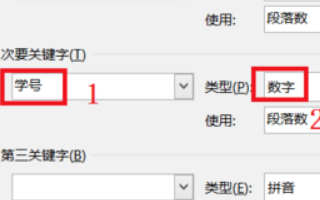 5、再将“次要关键字”选为【学号】,类型也为【数字】。排序为【升序】。