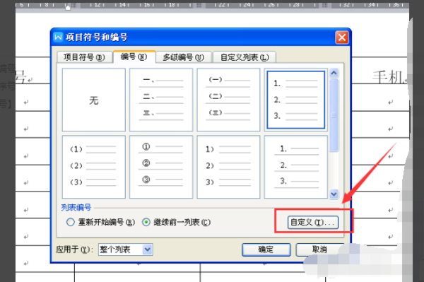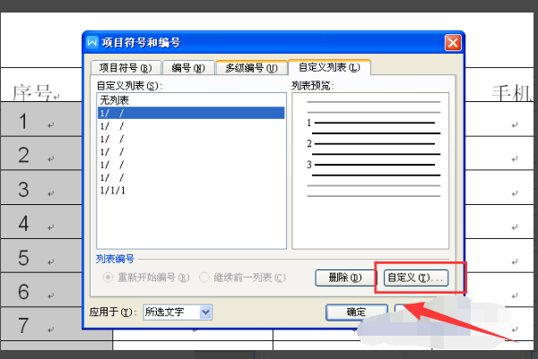 3、在弹出的窗口中找到并点击选择选择自定义选项,序号右下角的标点去掉,找到自定义编号选项之后点击进入自定义选项;