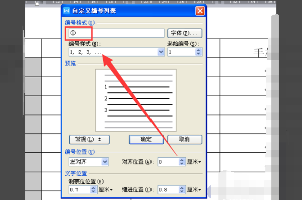 4、然后点击进入自定义编号列表,这里只需要在编号格式中,将右下角的点删除,其余地方无需改动,完成之后点击确定选项;