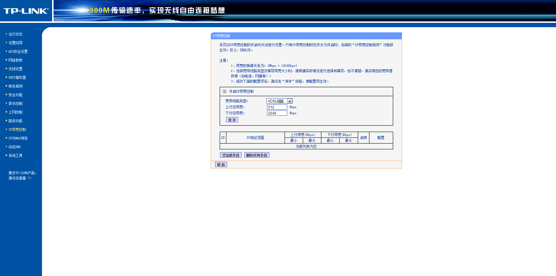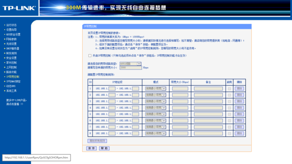6、重复前面两步,至到添加完成所有的IP。7、再单击左侧的“IP带宽控制”链接,在右边勾选上“开启IP带宽控制”复选框并在下面选择正确的网速。