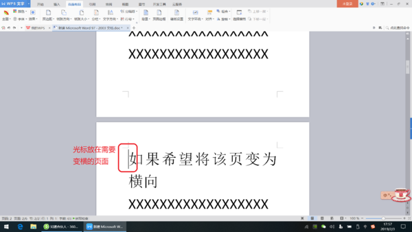 4. 如果需要将某一页之后的文档变为横向,先将光标放在前一页末尾的位置。