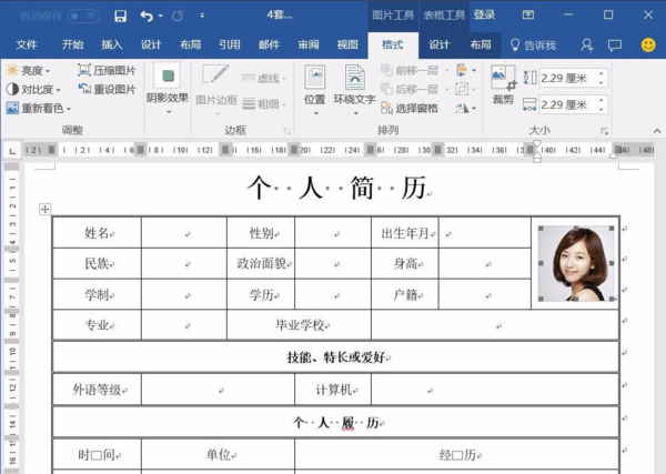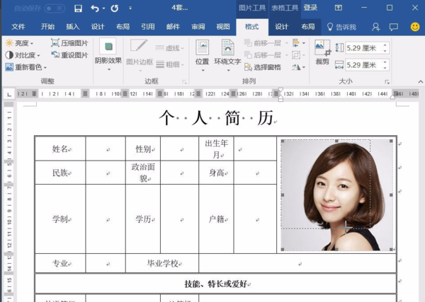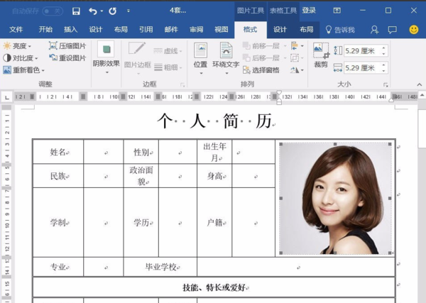 6、调整到合适大小即可,插入照片的简历表格如下图所示。