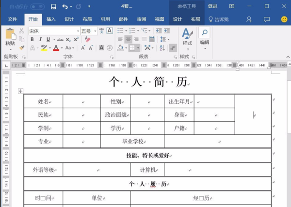 1、打开word文档,已经制作完成了简历表格,如下图。