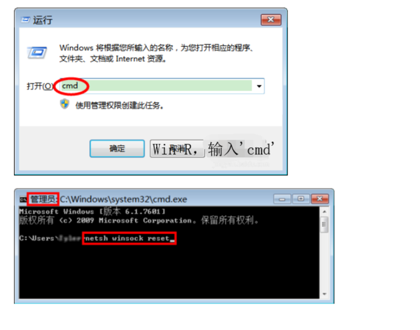 按下Win+R,打开运行对话框,输入"cmd",回车打开命令行程序,确认命令行程序运行在管理员模式(标题中有"管理员"字样)。在命令行程序中输入netsh winsock reset,然后重启电脑。