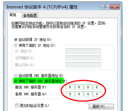 选择"使用自定义的DNS服务器",首选DNS服务器输入8.8.8.8,备选DNS服务器输入8.8.4.4,点"确定"。