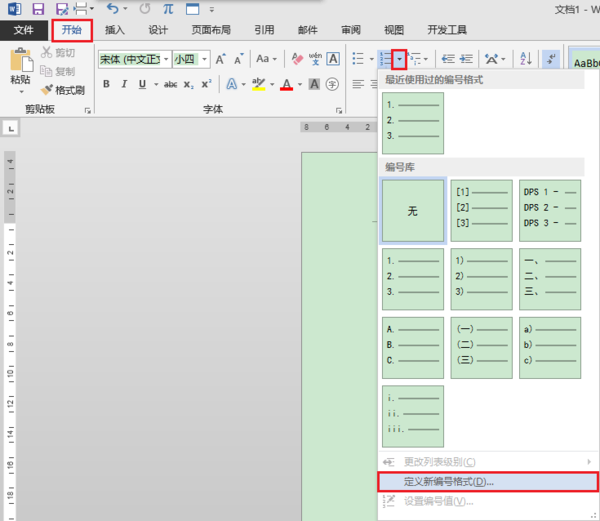 一、单击“开始”选项卡“段落”区域“编号”右边的下拉箭头,选择“定义新编号格式”;