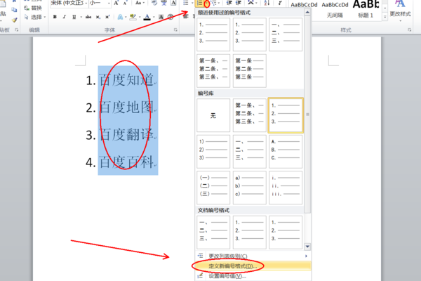 word设置编号格式,可通过定义新编号格式自定义设置编号格式。