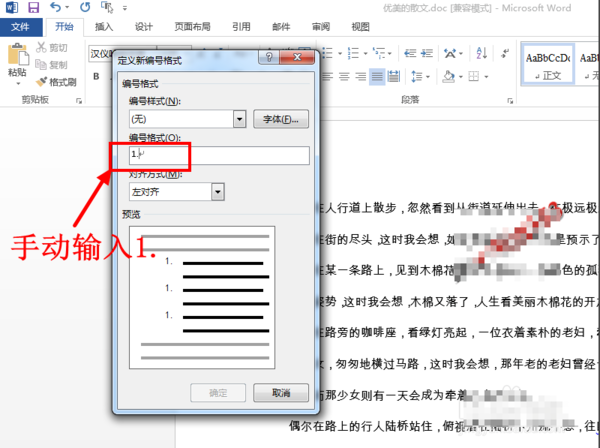 3、接下来在编号格式的输入框中手动输入“1.”。