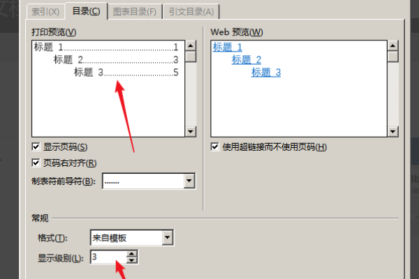 4、在打开的窗口中,可以看到,软件默认的目录中标题级别是显示三个级别,可以点击【显示级别】中的数字更改显示的级别。比如,原文有4个级别的标题,则把【显示级别】改为4。