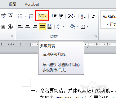 A、在工具栏,如下图,点击多级列表,倒数第三行点击进入即可,如下图;