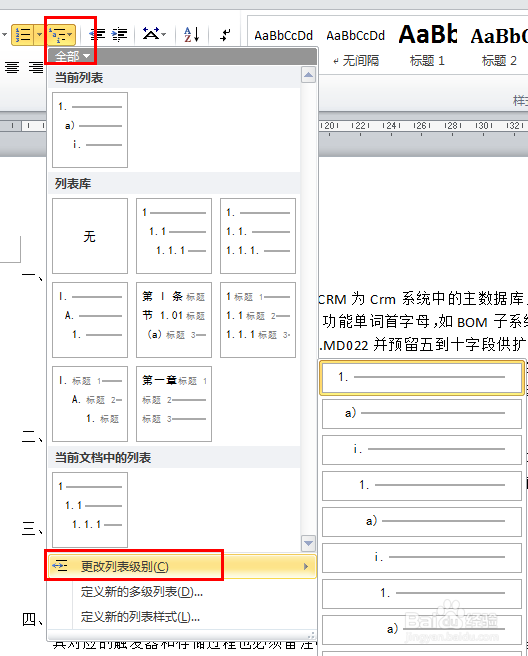 D、在工具栏上,点击“编号”工具,在副菜单中选中“更改列表级别”进行修改,如下图;