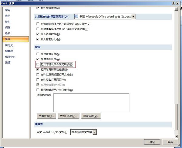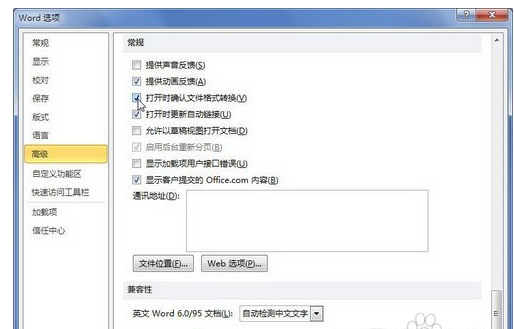 第2步,打开“Word选项”对话框,切换到“高级”选项卡。在“常规”区域选中“打开时确认文件格式转换”复选框,并单击“确定”按钮,如图2012022508所示。