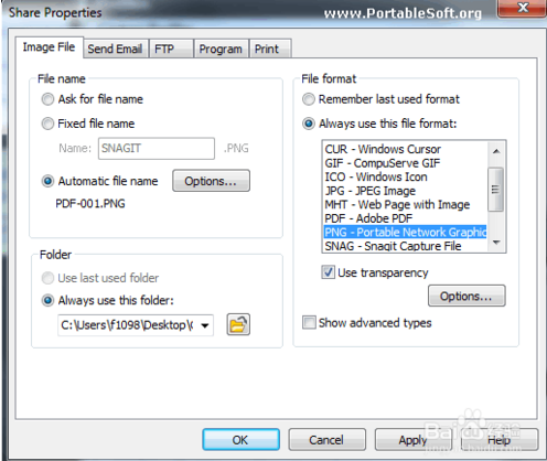 然后,单击上述Share菜单下的Properties,将File name选择为Automatic file name,在File format和Folder中设置文件格式和存放目录。