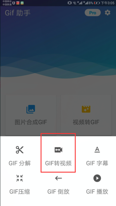 5、在下方出现的菜单中,点击“GIF转视频”选项