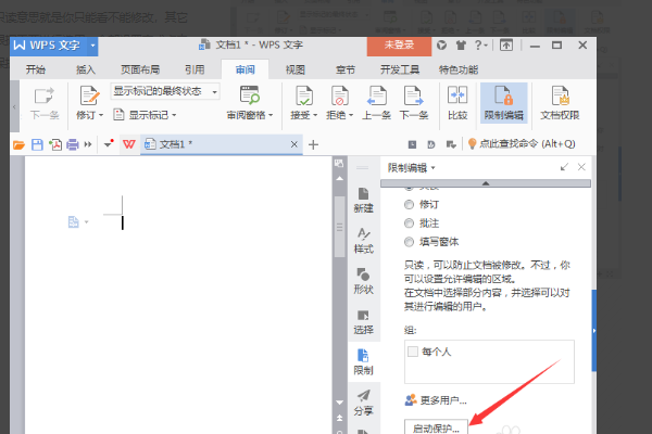 6、选项中设置文档的保护方式大家可能不陌生,只读意思就是你只能看不能修改,其它三项根据需要进行选用,全部设置完成点击启动保护,如图所示。