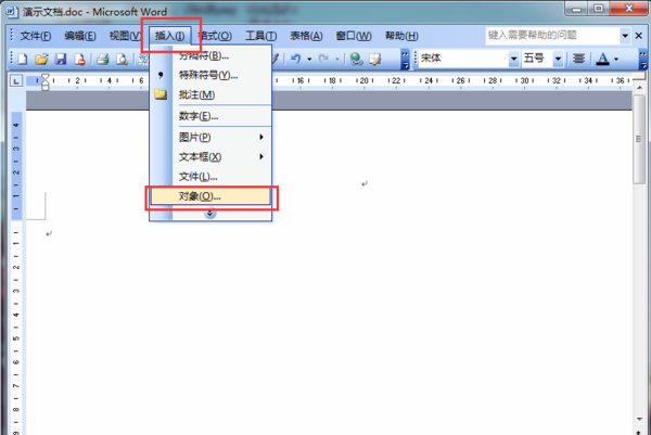 2、待打开word文件以后,在word文档菜单栏找到“插入”,然后点击“插入”在该菜单栏下找到“对象”选项;