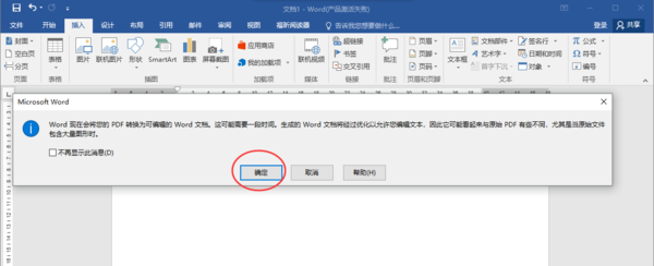5、点击“确定”后,稍等几分钟,然后等待word将pdf图片转入完成,此时整个pdf的所有内容都将转入word,我们再根据内容,将多余的图片或者文字删除即可。