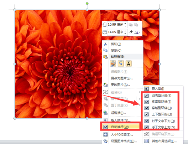 3.可以右击插入的图片,选择”自动换行“,在它展开的列表里,选择特定的环绕方式,不能选择”嵌入型“,其他任意一种方式都可以;