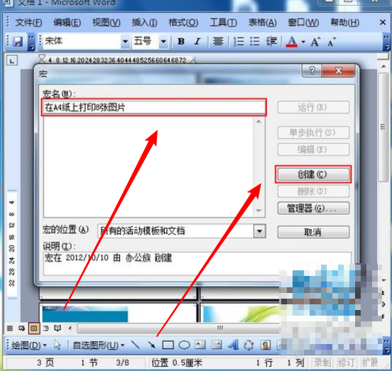 2、此时弹出“宏”设置窗口,在“宏名”下输入名称,输入完成后点击“创建”如下图。