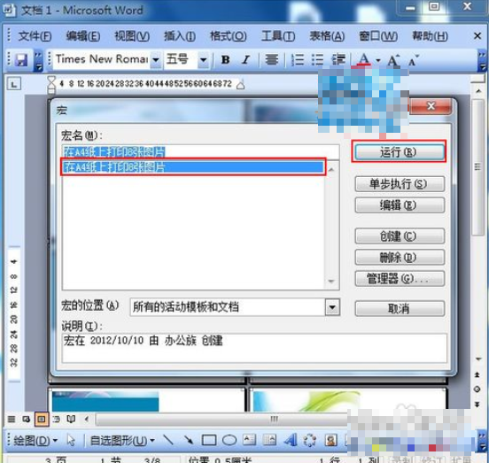 9、再回到Word文档界面,单击菜单栏“工具”→“宏(M)”→“宏(M)”选择刚才输入的名称点击“运行”即可。
