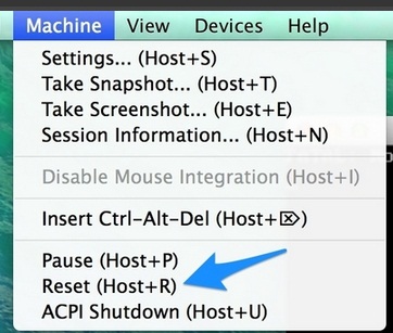 5、在 Mac 系统的顶部 Virtual Box 的“Machine”菜单中,点击“Reset”选项(也可按键盘上的 command+R 键),重新启动虚拟机。