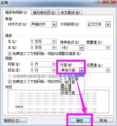 2.打开”段落“界面后,在”行距“一栏,点击小三角形按钮,在下拉列表里直接选择”单倍行距“,再点击”确定“即可。
