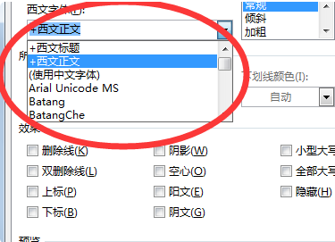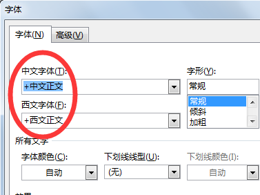 4、即可进入字体设置的对话框,其中可以看到中文字体和西文字体两个选项。