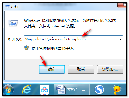 2、输入快捷键以后,在弹出的运行窗口栏里输入命令:“%appdata%\microsoft\Templates”并点击确定按钮;