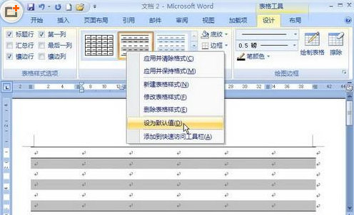 打开Word 2007文档窗口,首先插入任意格式的表格。单击新建的表格,在打开Word 2007“表格工具”功能区中切换到“设计”选项卡。然后在“表样式”分组中右键单击任意表格样式,选择“设为默认值”命令。