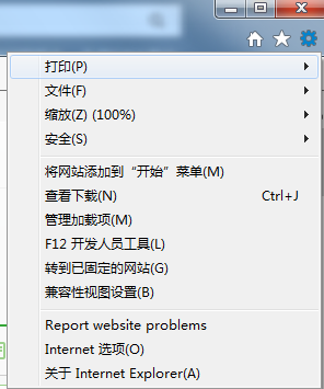 1、启动ie,点击设置按钮,弹出菜单选择internet选项命令;