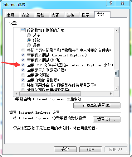 2、点击高级选项卡,点击勾选“启用FTP文件夹视图(在InternetExplorer之外)”,点击确定即可。