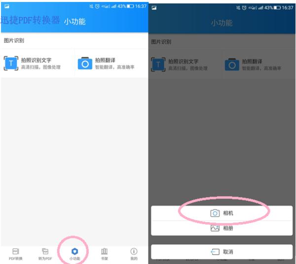 第一步:在手机里找一个拍照识别文字工具,然后在小功能里找到拍照识别文字,然后选择相机,,同时选择相册也可以。从相册里找到需要识别的图片,然后点击完成