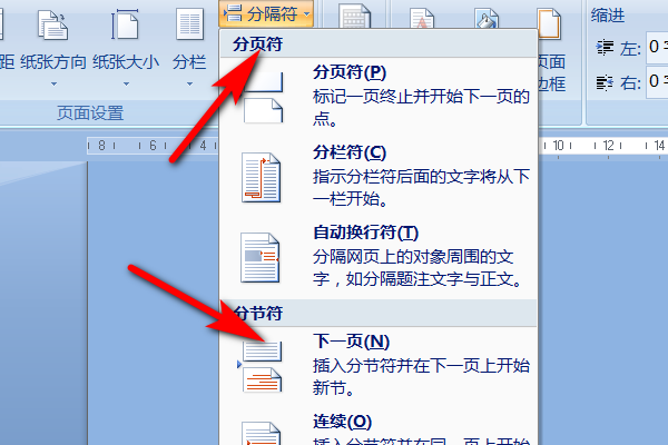 3、接着依次选择工具栏 - - 分隔符 - 分节符(下一页)。之后会自动生成一空白页,这是新的一节,添加页码的时候,章节之间可以设置不受影响。