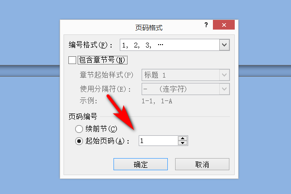 5、进入到页码格式之后,选中起始页码,并将起始页码设置为1,确定即可。
