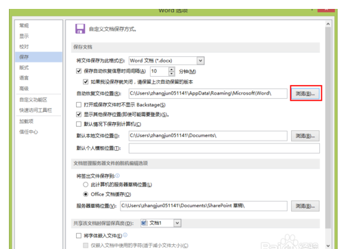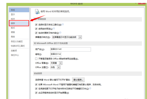 在弹出的word选项对话框中选择“保存”